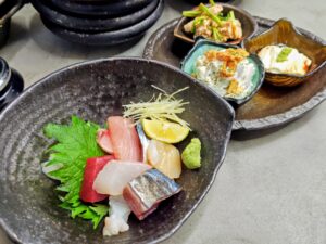 鮭の西京漬け200円と鶏の唐揚げ150円、鉄火巻き400円と大瓶ビ-