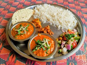 水槽の光でわかりにくいかもですが、シマチョウの茶色、豆カレーの黄色、グリーン風カレーの緑に副菜と彩り豊かです。
