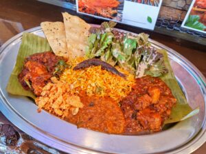 半分ほど色々な組み合わせを楽しんでから、ざっくり副菜をライスと混ぜ合わせて出汁カレーをダイブ!