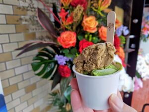 イートインスペース兼用で、手前はチョコレート、奥のイートインでは女子さん達が美味しそうにスイーツを召し上がれています。