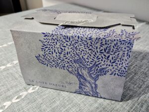 竹皮がプリントされたBOXにあべかわもち、きな粉、黒蜜、割り箸が入っています。
