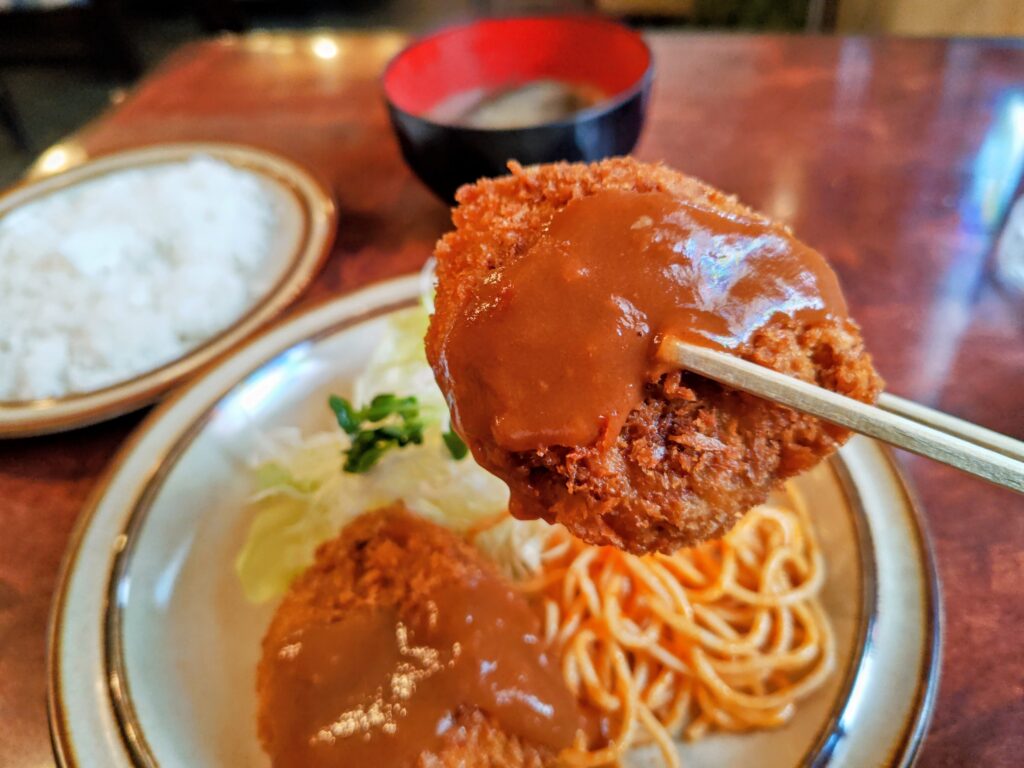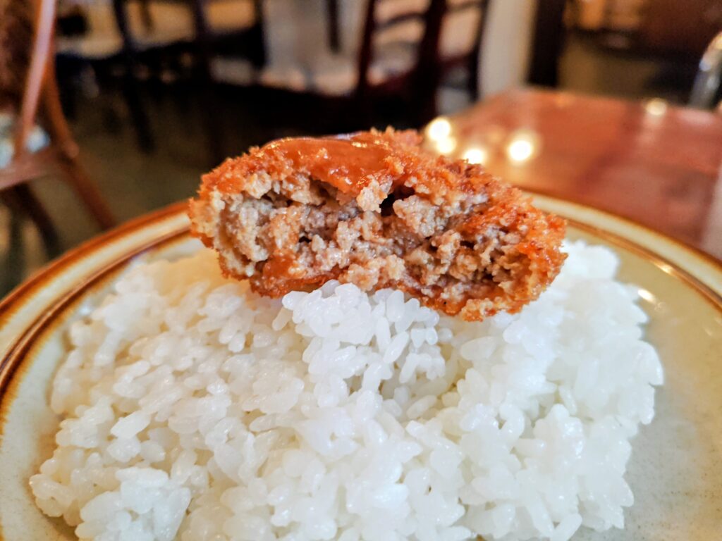 ミンチカツは特製ソースがかかり、やや粗めのパン粉!