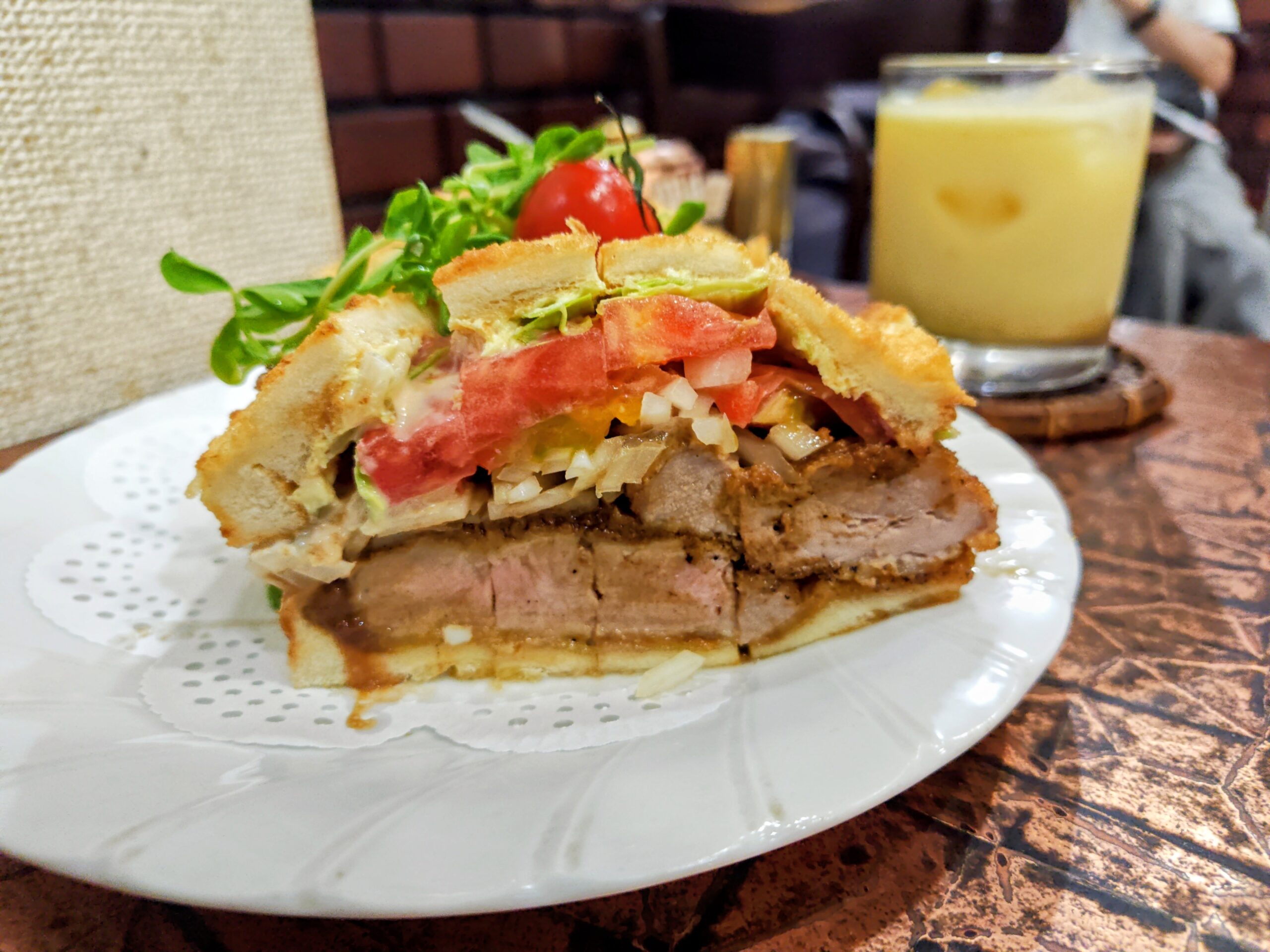 サンドは1口サイズにカットされており、頬張った瞬間にジュワーっと美味しいヒレカツ、酸味のあるソースと野菜の一体感で旨いです。