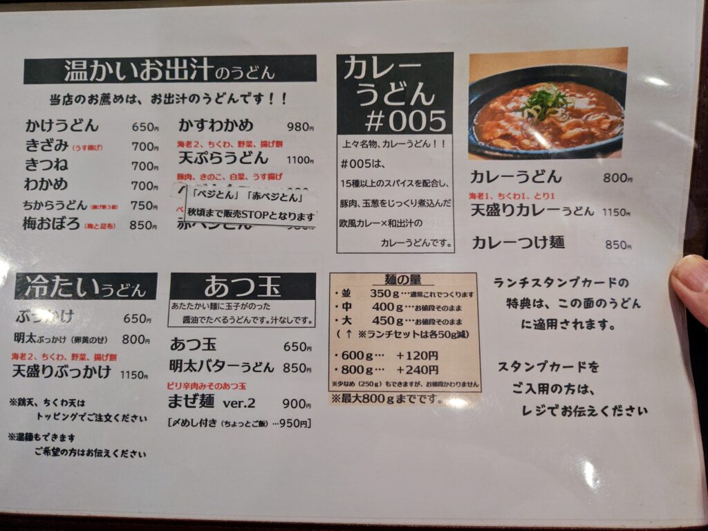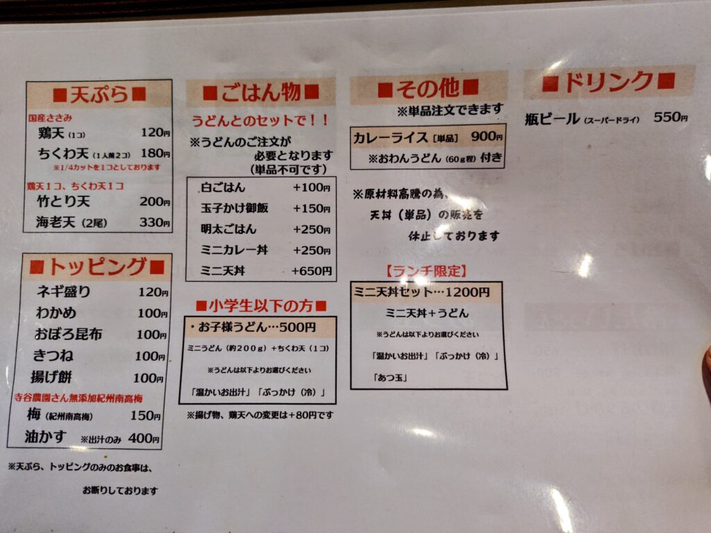 通常メニューは温かいお出汁のうどん、冷たいうどん、あつ玉、かれーうどんに天ぷら、トッピング、ごはん物!