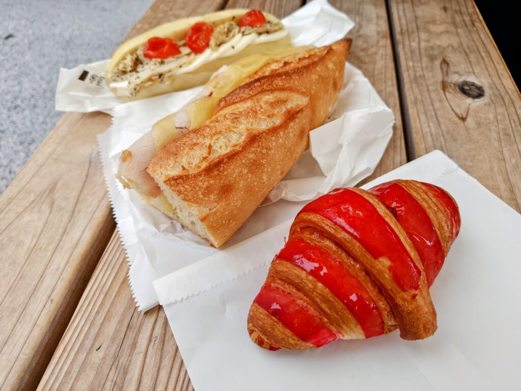 クロワッサン ルージュ702円、パリジャンサンド1,620円、モッツァレラとバジルチキンのサンド1,620円の合計3,942円なり。