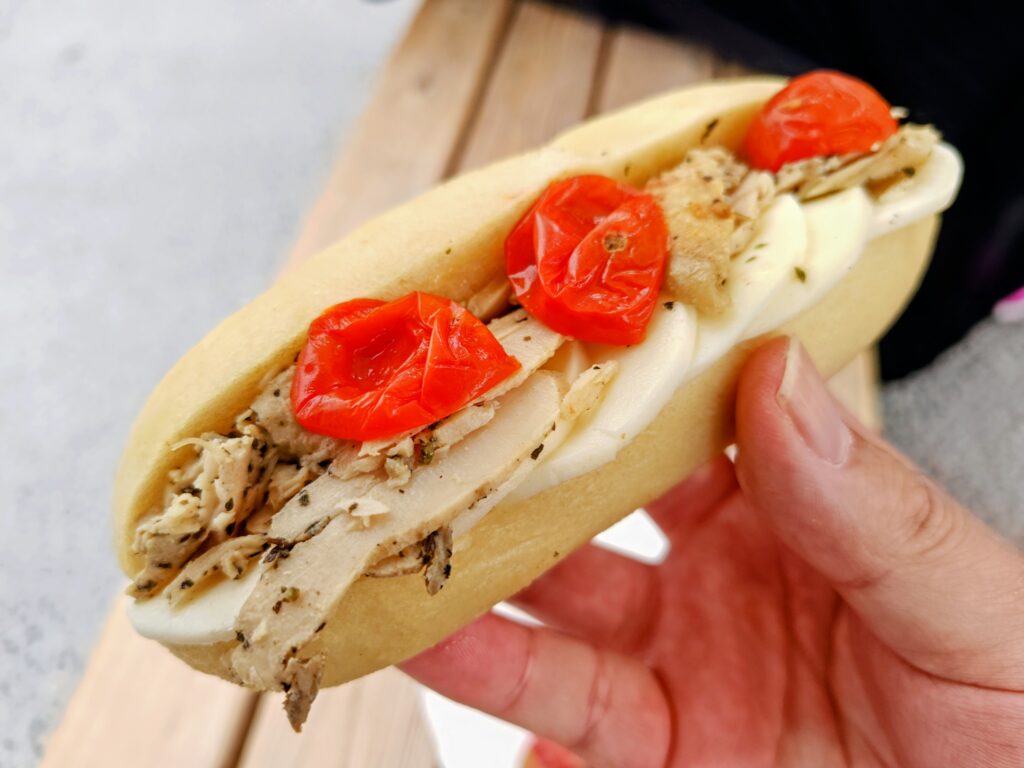 バジルソースのかかったチキン、モッツァレラ、焼きミニトマト、玉子をはさんだサンドイッチ!
