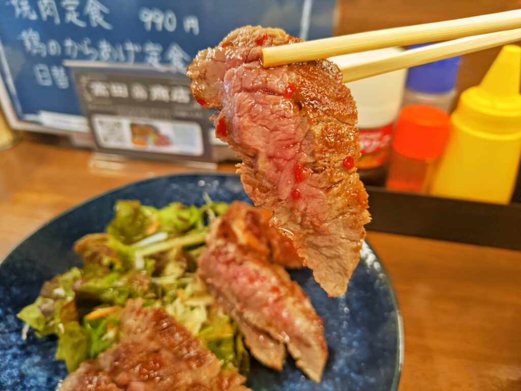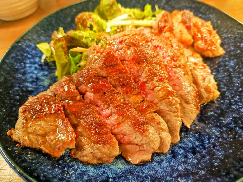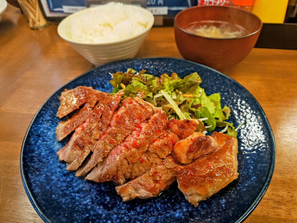 豚しょうが焼き、焼肉は中華鍋で調理され、ステーキは塩胡椒され分厚い鉄板で焼かれます。