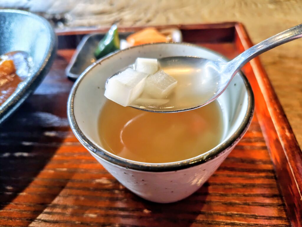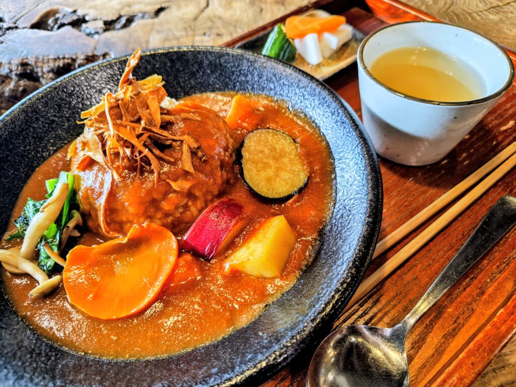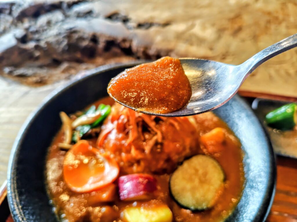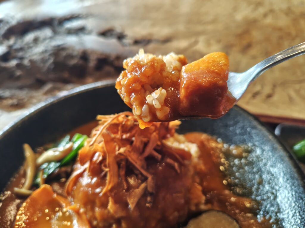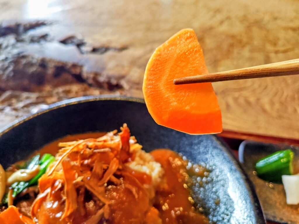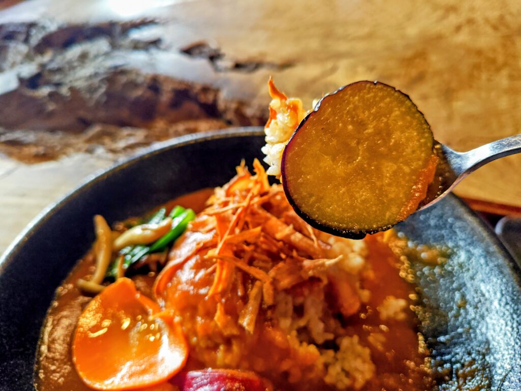 小さめですがトロトロで素揚げの野菜の下に隠れており、少し得した気持ちになります。