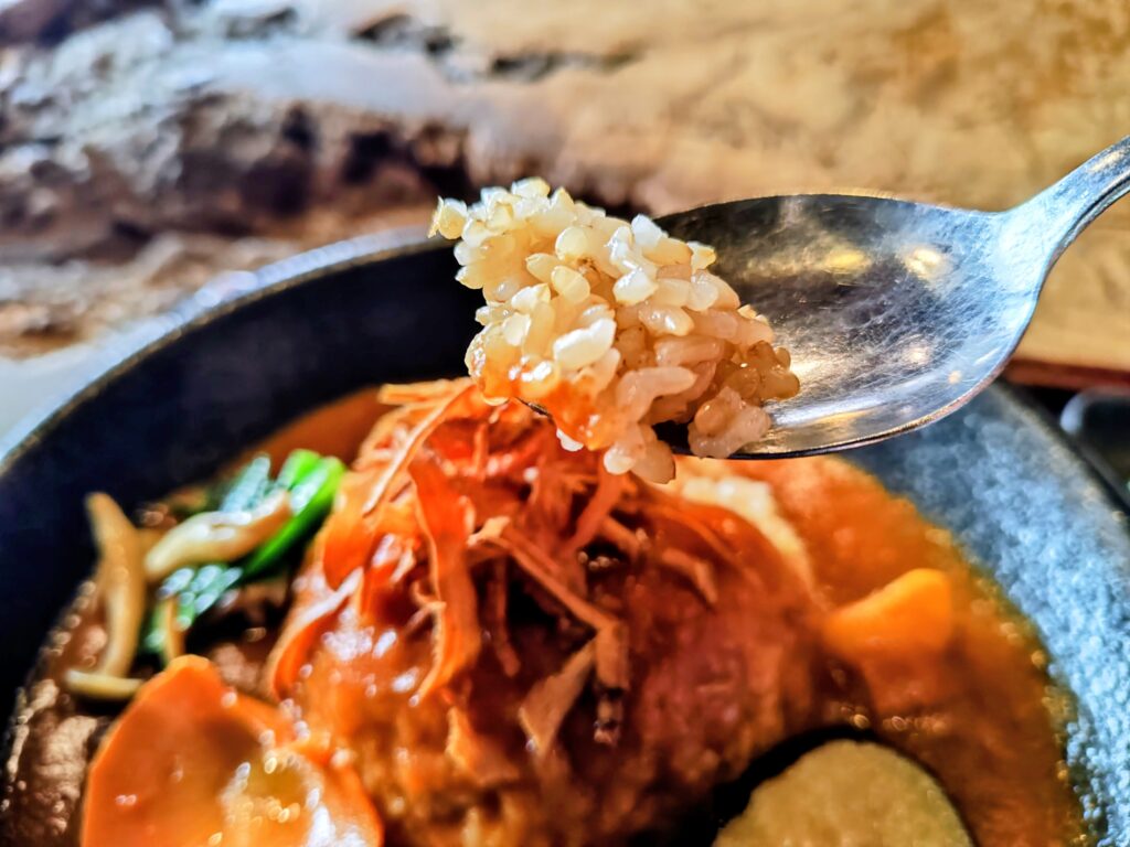 やや硬めの炊き加減で、この粘性高いルーと一緒に食べるのに丁度よいと思います。