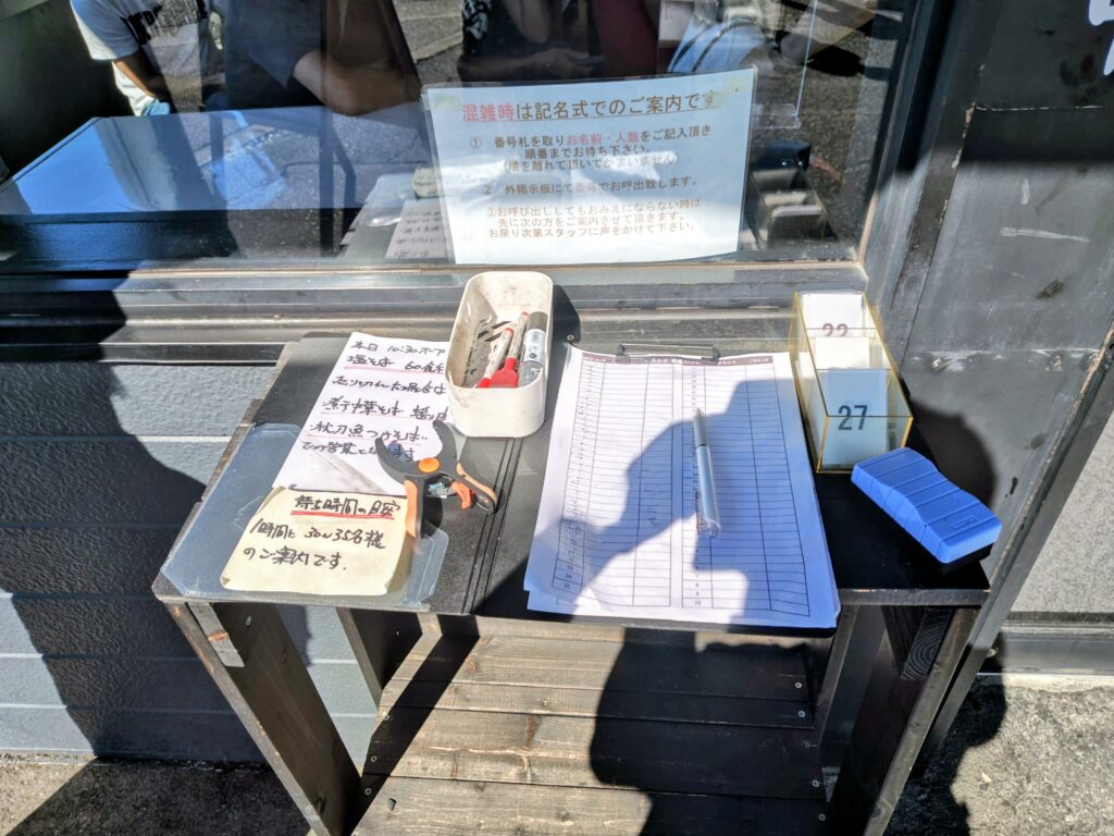 ウェイティングボードが出される時間は8~9時想定、その時間に記帳しておけば、極論を言うと好きな時間に来て食べれるシステムです。待ち時間の目安は1時間に30~35名様のラーメン提供。記帳の人数から訪問時間を推測するのがベターです。