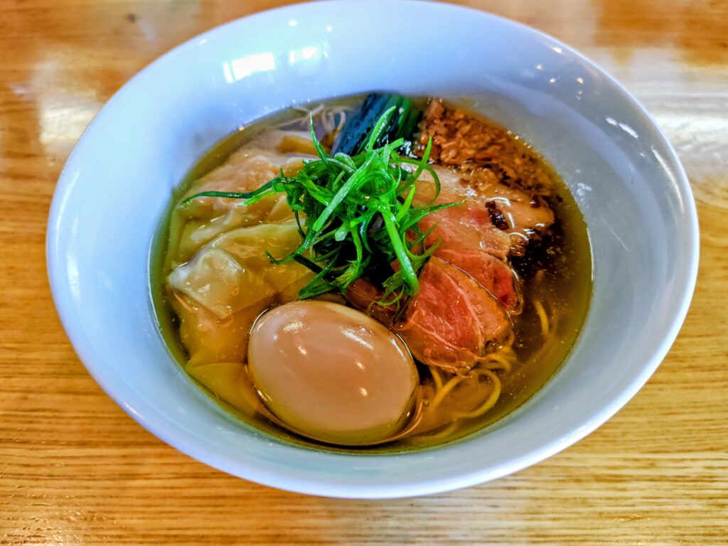 特製の具材は鴨ロースチャーシュー、豚バラチャーシュー、海老ワンタン、煮卵、青葱、青菜、フライドオニオン!