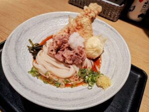 特製の具材は鴨ロースチャーシュー、豚バラチャーシュー、海老ワンタン、煮卵、青葱、青菜、フライドオニオン!