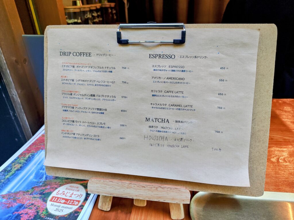 ドリンクはドリップコーヒー、エスプレッソ系ドリンク、抹茶系ドリンク。