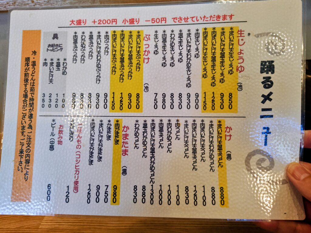 踊るメニューは、生じょうゆ(冷)、ぶっかけ(冷)、かけ(温)、かまたま(温)にトッピング、ごはんものがあります。