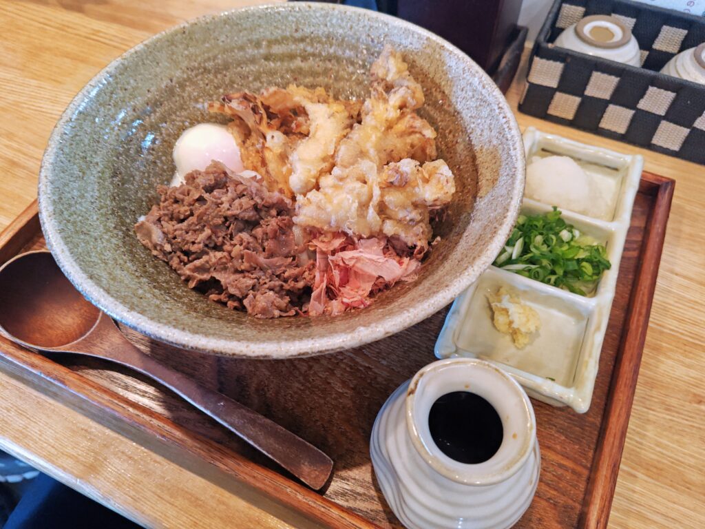 大根おろし、刻み葱、おろし生姜、ぶっかけ出汁は別皿です。