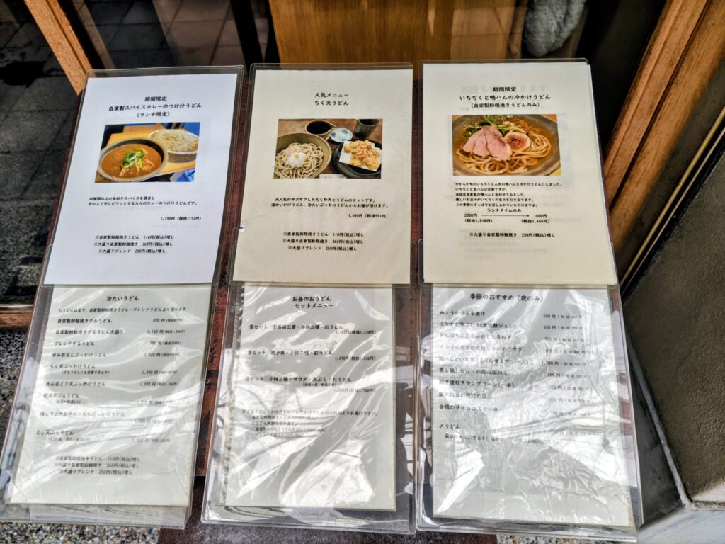 店外メニューには期間限定、冷たいおうどん、お昼のおうどんセットメニュー、季節のおすすめ(夜のみ)の掲載あり。この日の期間限定は自家製スパイスカレーのつけ汁うどん(ランチ限定)、いちじくと鴨ハムの冷かけうどん(いちじくの入荷終了で終了)のラインナップです。
