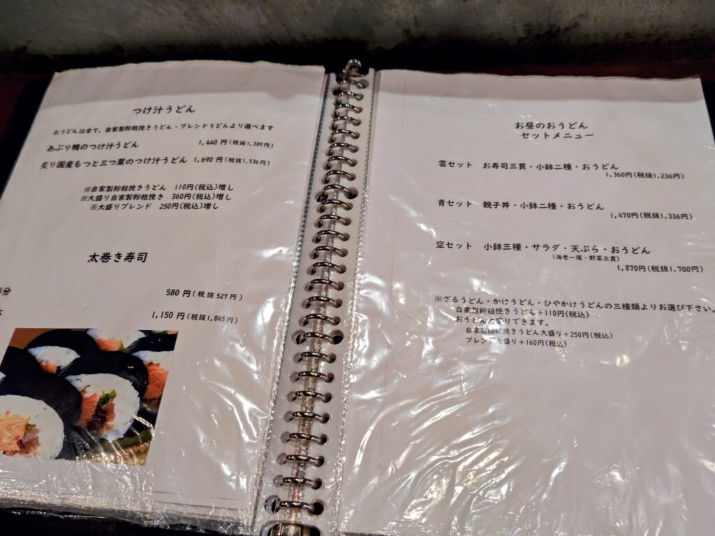 店内メニューには店外プラス太巻き寿司、温かいうどんの記載があります。