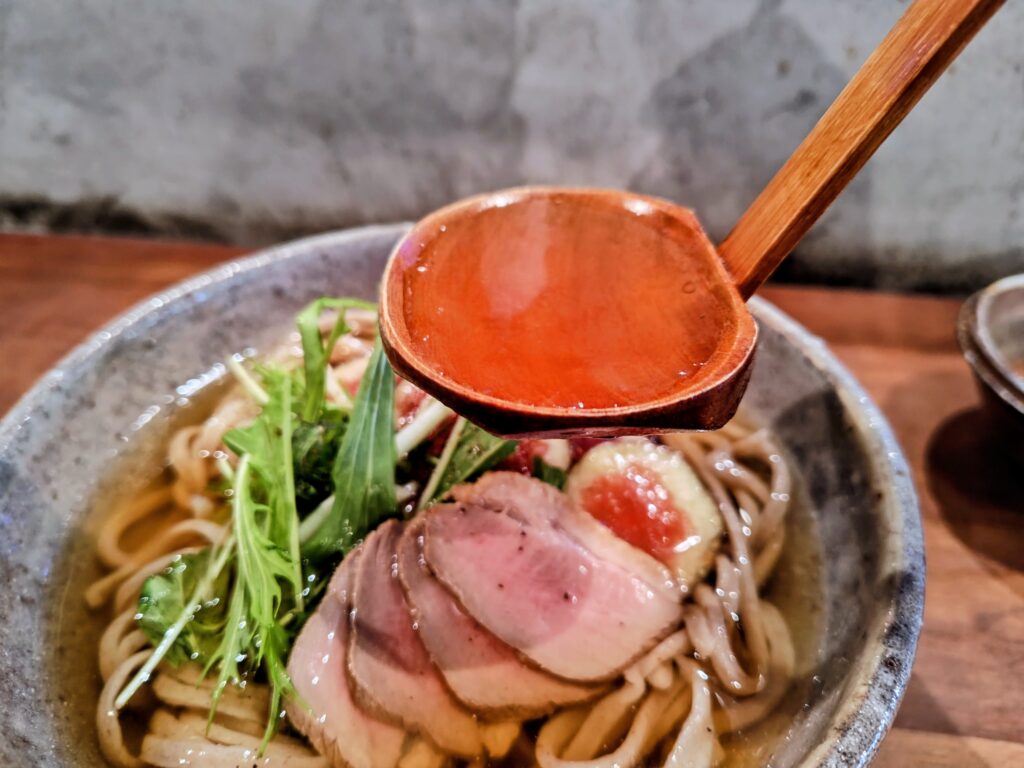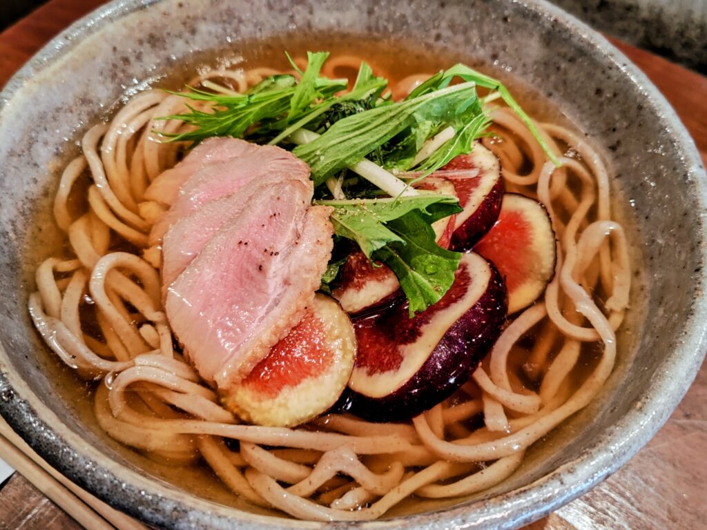 澄み切った冷かけ出汁に鴨ハムとイチジク!