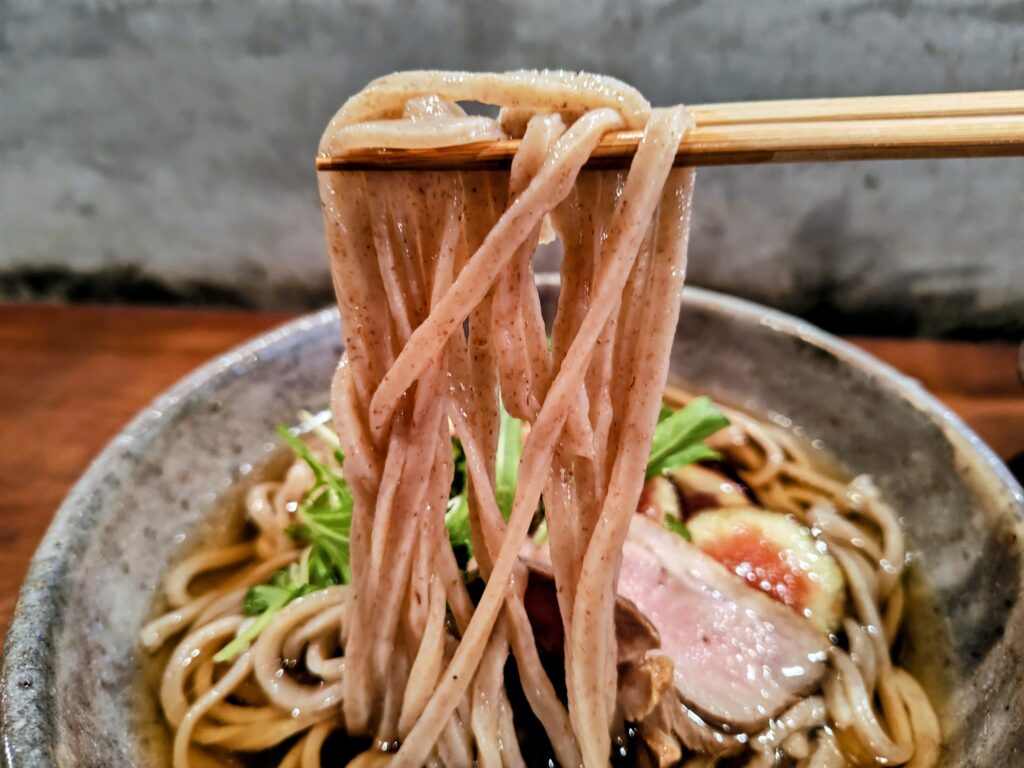 全粒粉使用の蕎麦と見間違う色とシルエットですが、小麦の風味が強くモチモチとした弾力が特徴です。