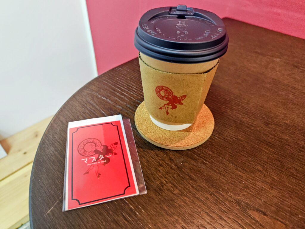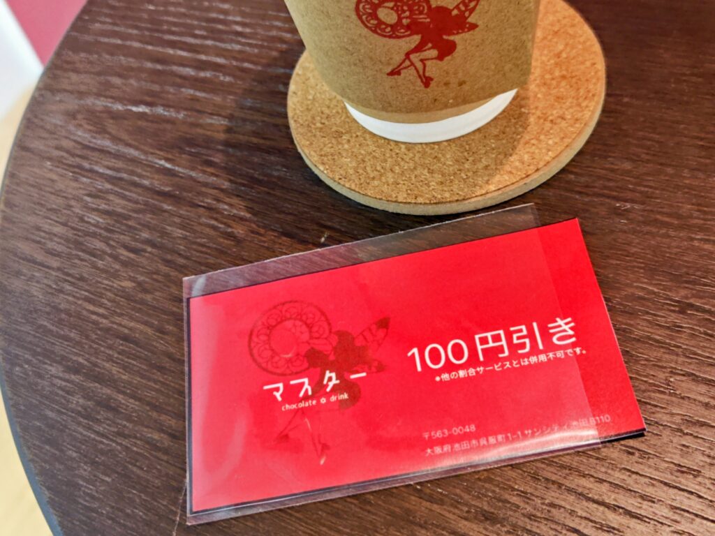 蓋付きカップにホットチョコレートは注がれ、マスターさんの名刺と100円引きのチケット付き。