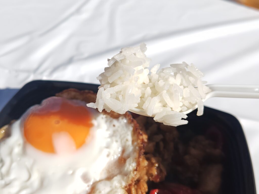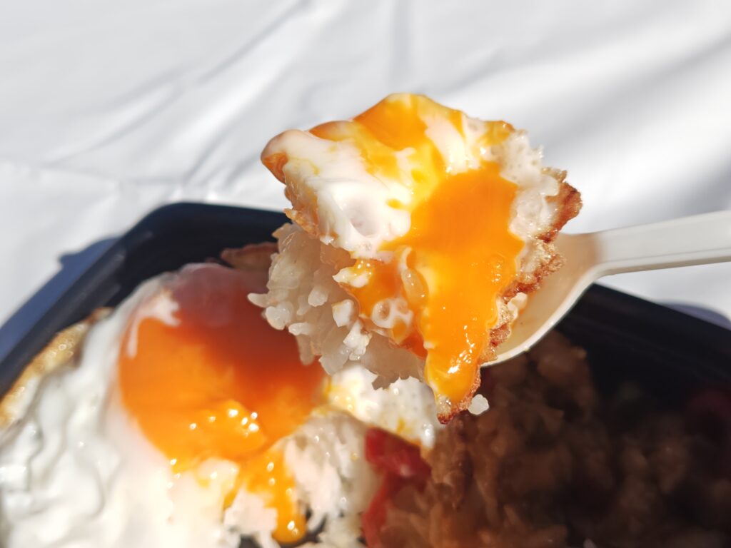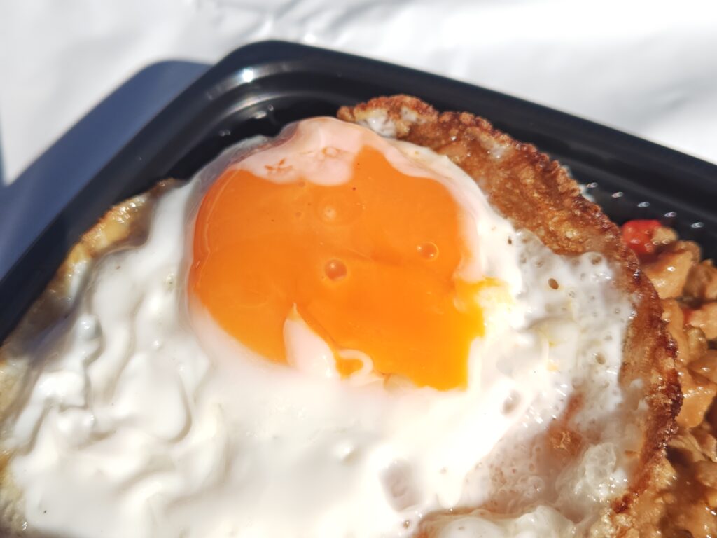 ライス上の目玉焼きの黄身はトロトロの白身のエッジはパリパリ!