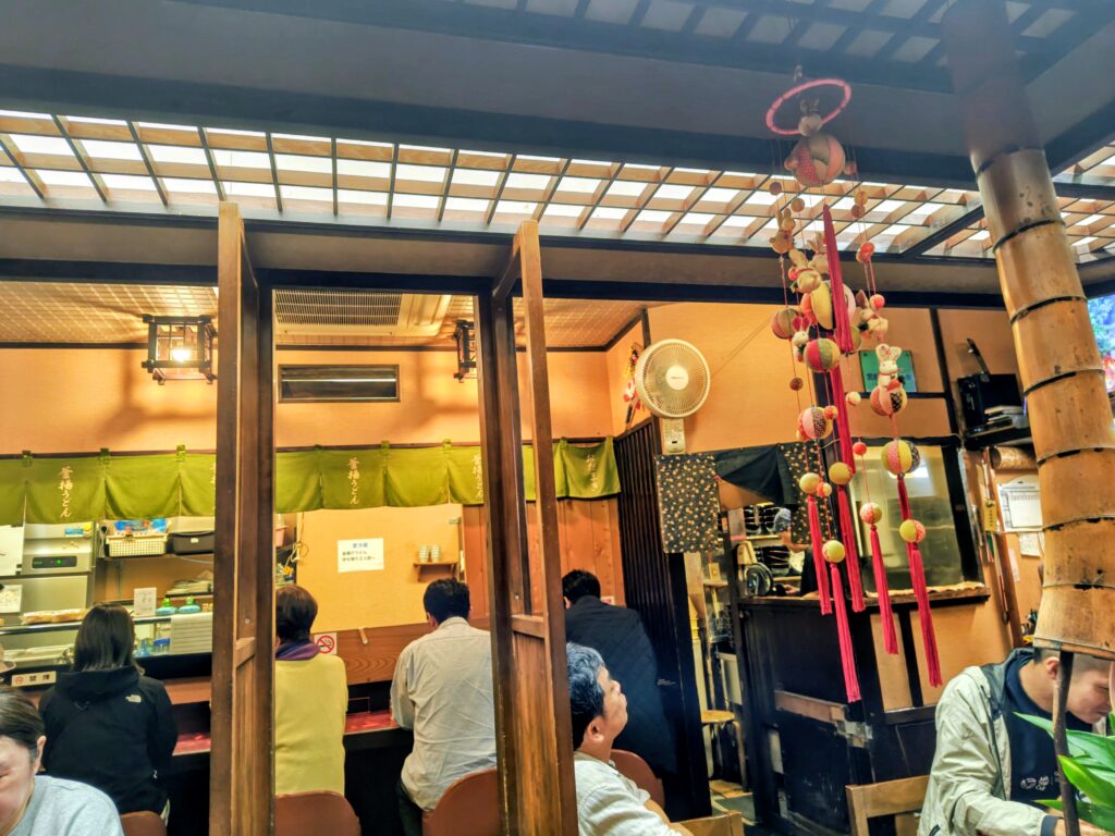 全席禁煙、全24席(カウンター6席、テーブル14席、座敷4席)ローカルTV番組が流され昔ながらのうどん屋さんの佇まいです。