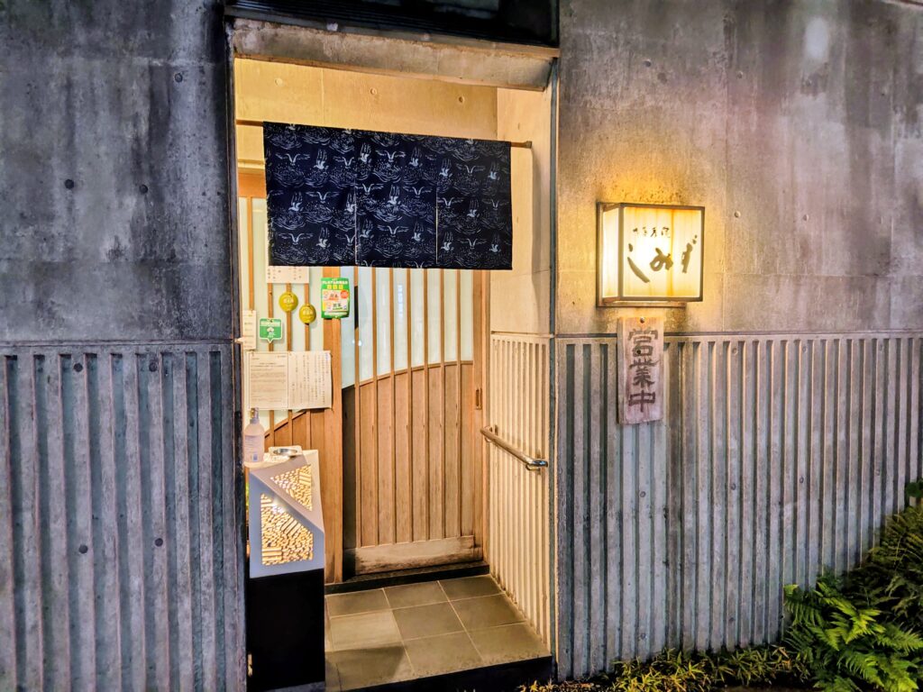 コンクリート打ち放しの躯体に暖簾がかかり、雰囲気あるアプローチです。