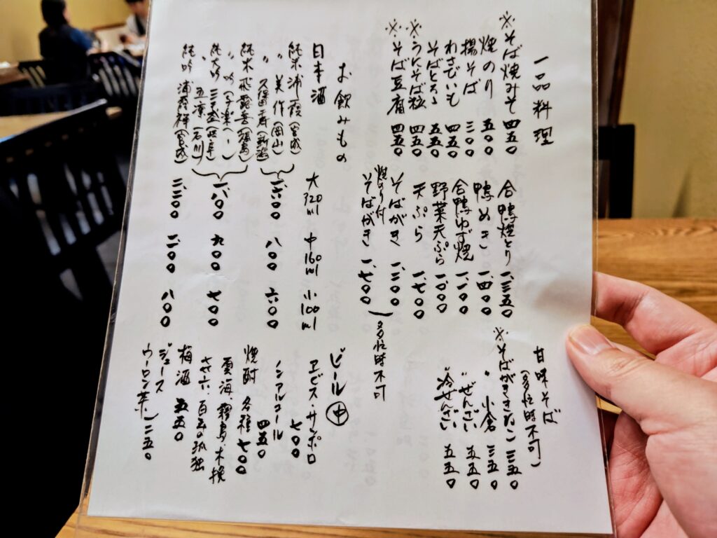 メニューは冷たいそば、温かいそば、蕎麦会席、一品料理にドリンク類。