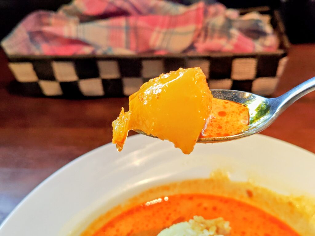 チキンはじっくり煮込まれしっとり柔らか、ジャガイモは大振りカットされこの刺激的なカレーに甘さが際立ちます。