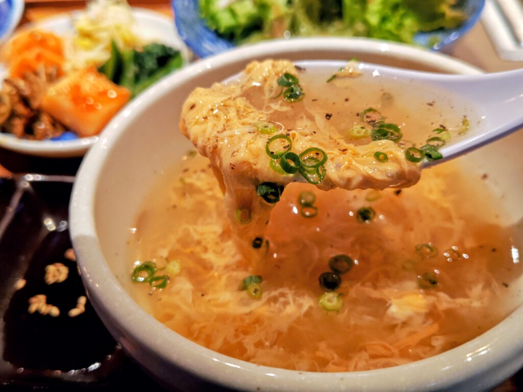 ガーデンサラダ、卵スープ、キムチ、釜焚きご飯(お代わり自由)付き!