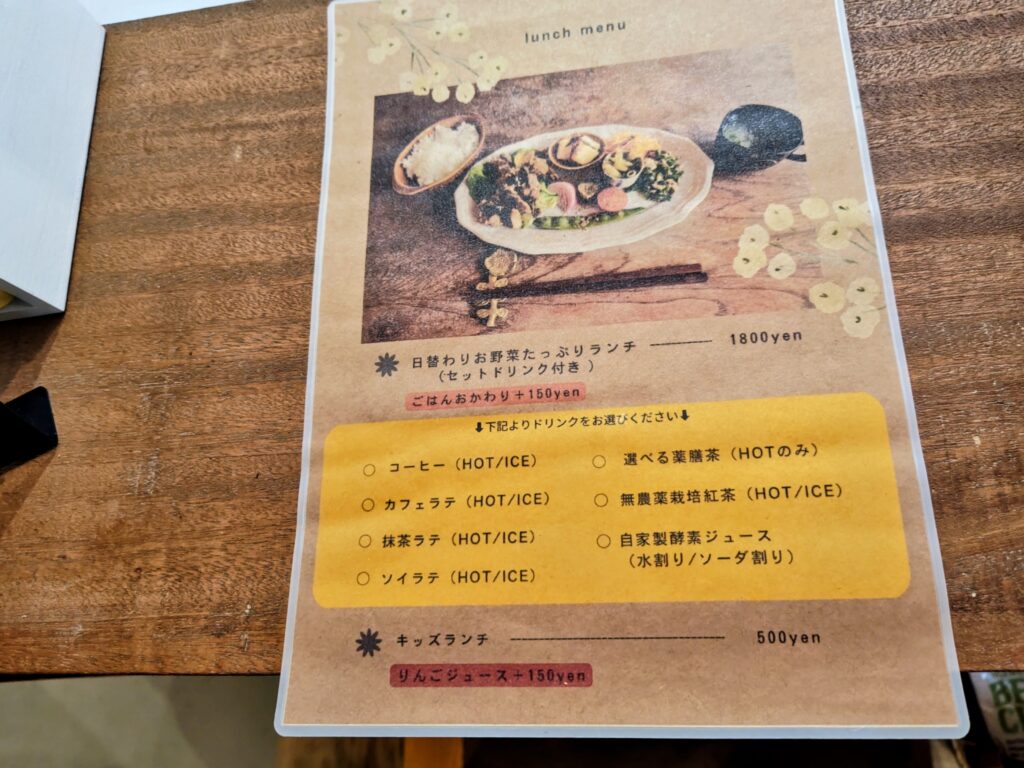 ランチは、日替わりお野菜たっぷりランチ、キッズランチ。