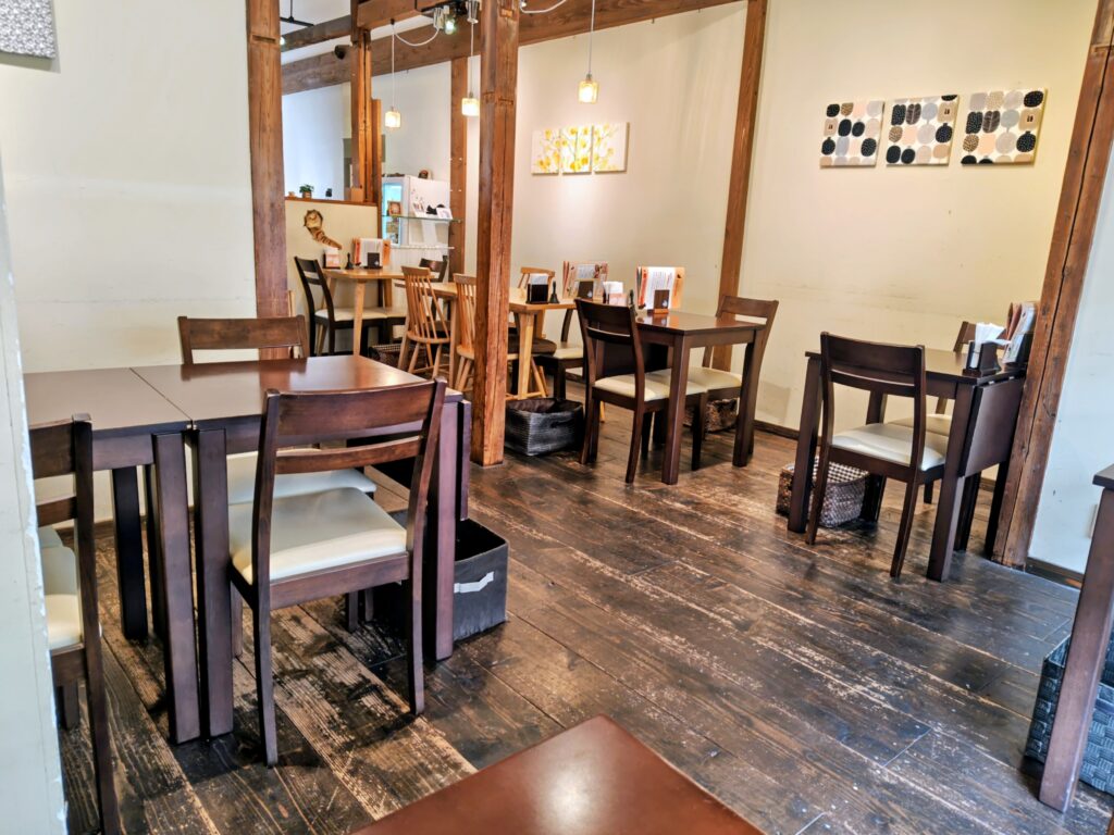 全席禁煙、全28席の古民家リノベの明るい店内です。