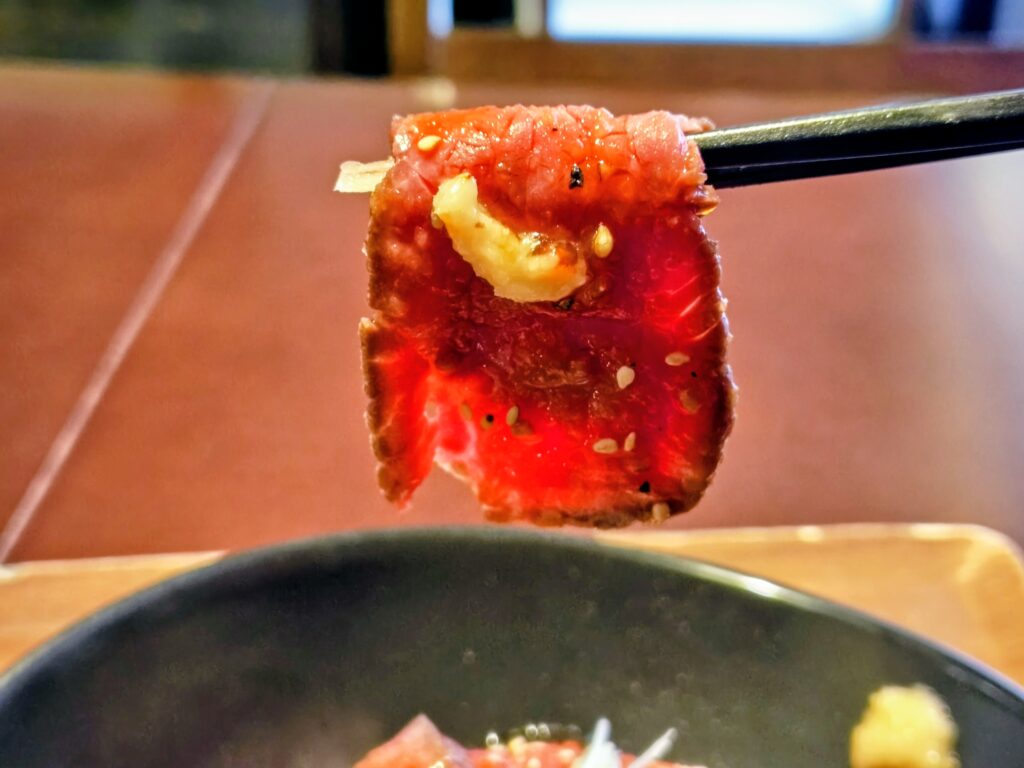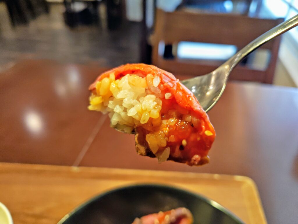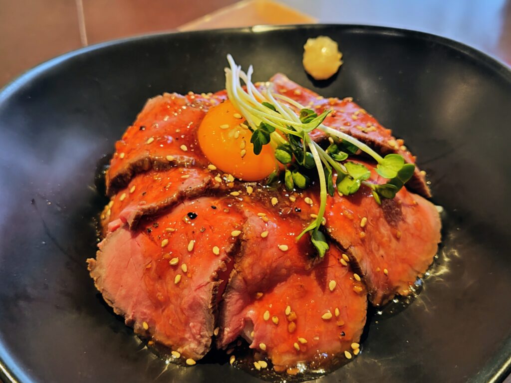 黄身、ローストビーフ、ご飯、タレの一体感!