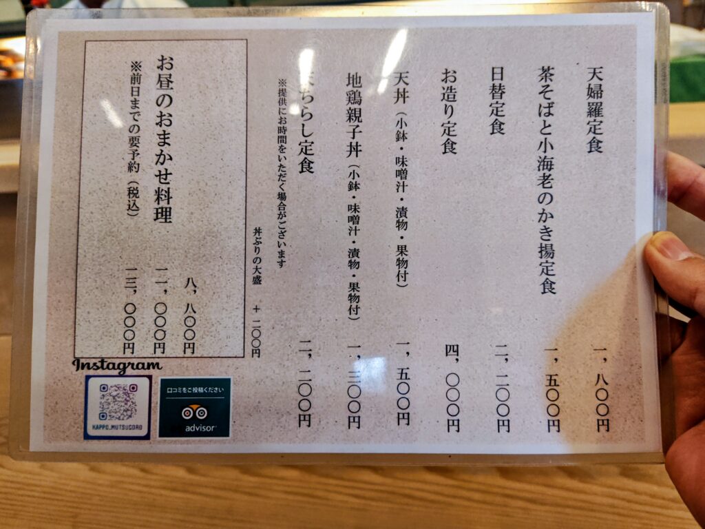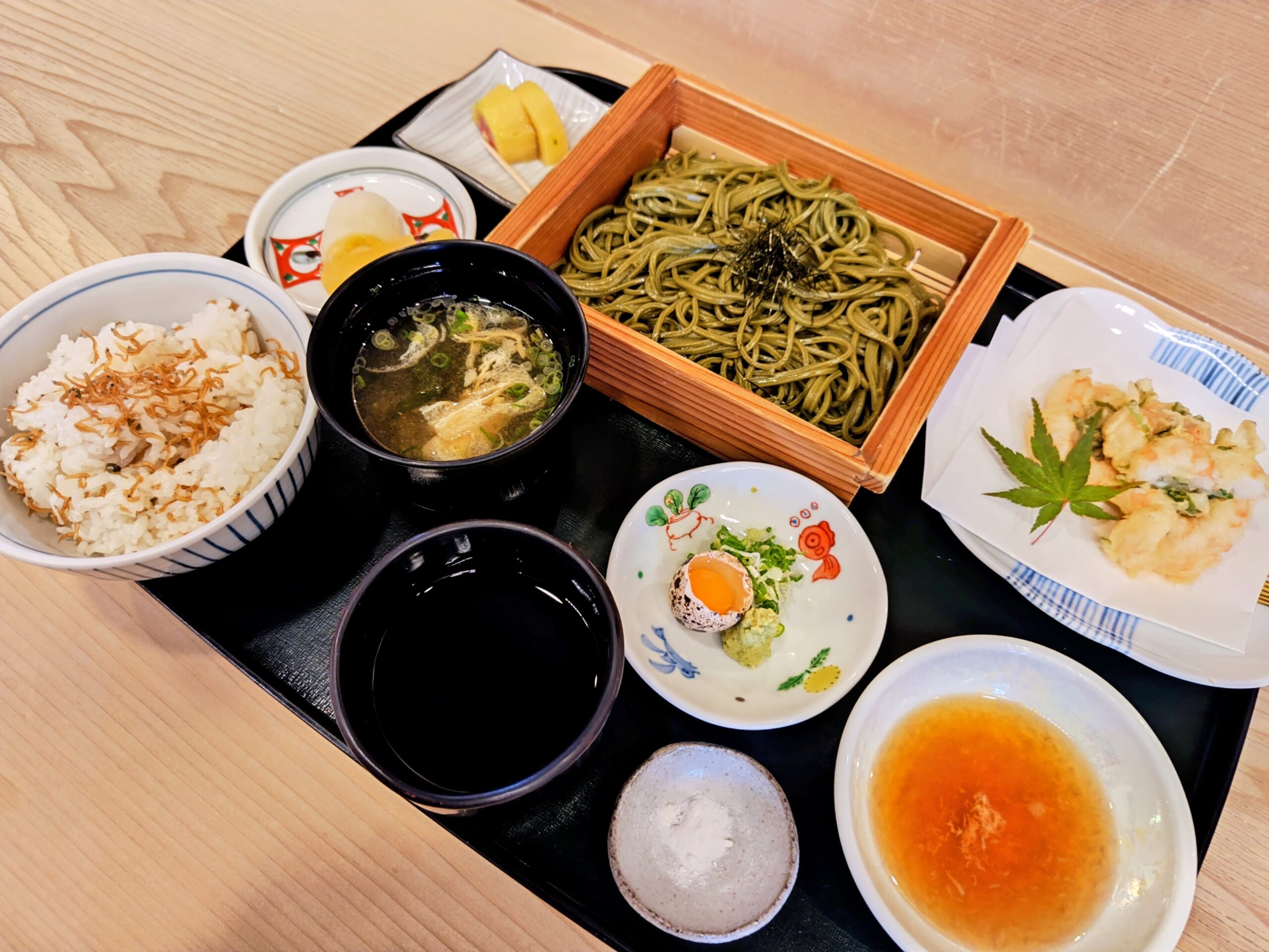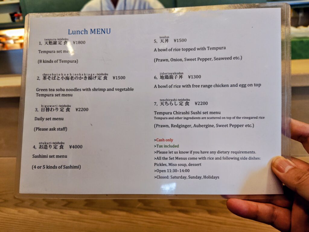 ランチメニューは天麩羅定食、茶そばと小海老のかき揚げ定食、日替わり定食、お造り定食、天丼 (小鉢、味噌汁、漬物、果物つき)、地鶏親子丼(小鉢、味噌汁、漬物、果物つき)、天ちらし定食の7種。