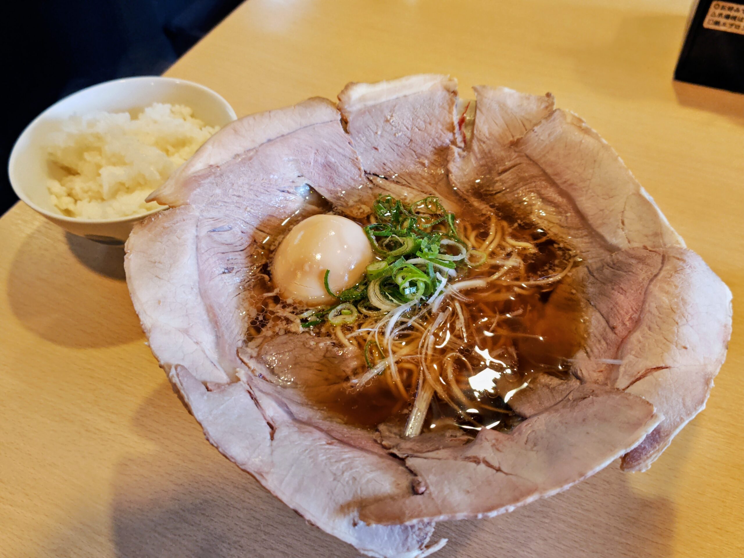 具材は薄切り豚レアチャーシュー、白髪ねぎ、刻み青ねぎ、トッピングの煮卵。