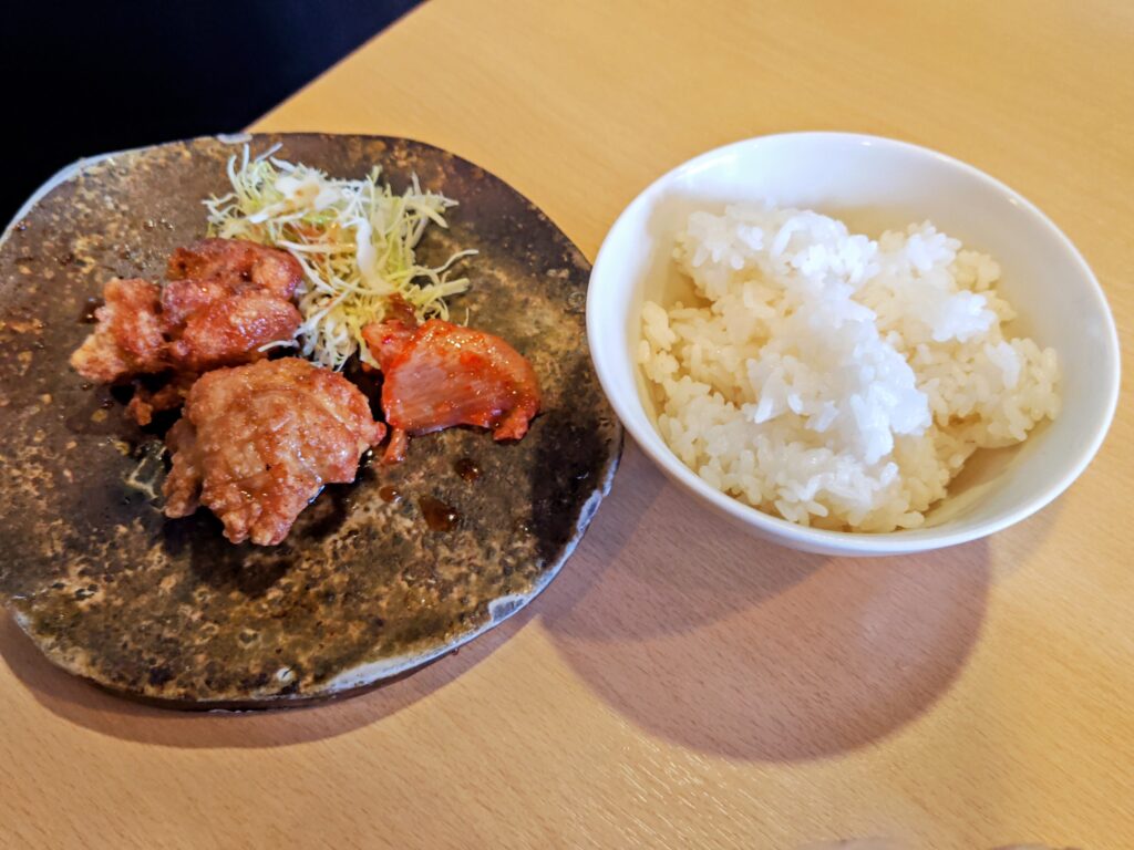 唐揚げ定食は、唐揚げ2個、キムチに小ご飯の組合せ。