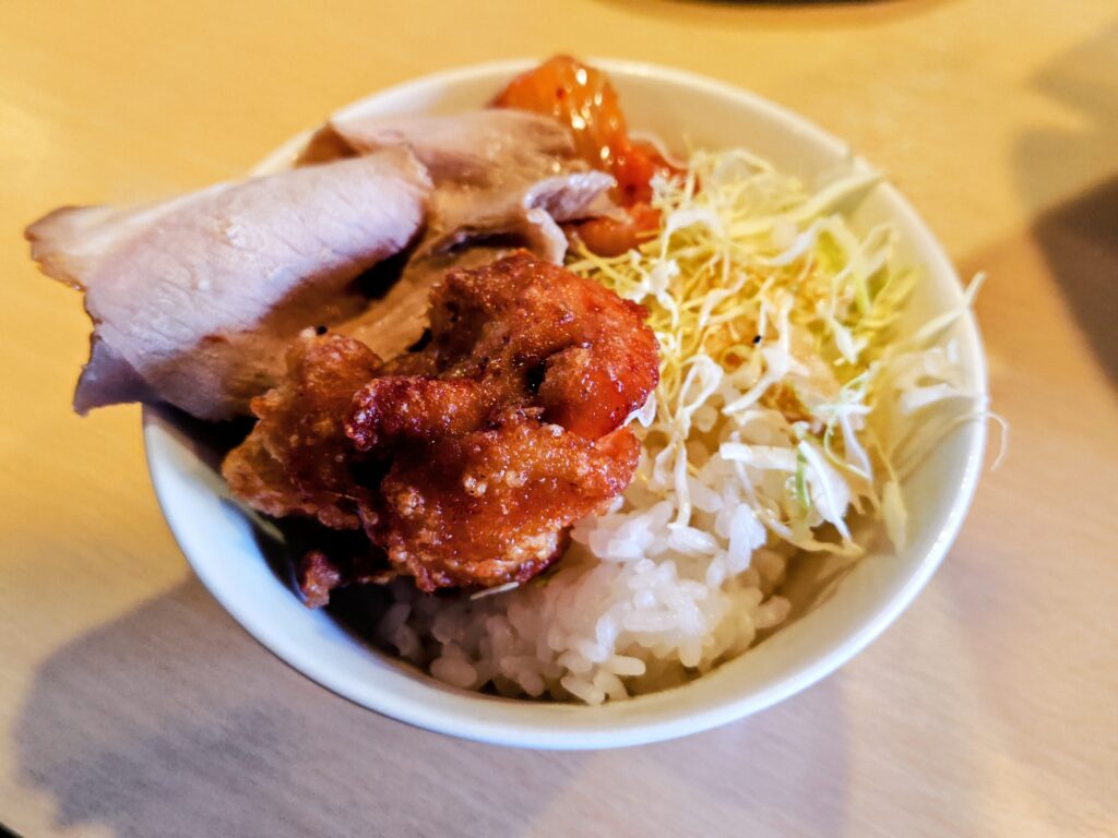 小ご飯に唐揚げ、チャーシュー、キムチを乗せ、ミニ丼に!