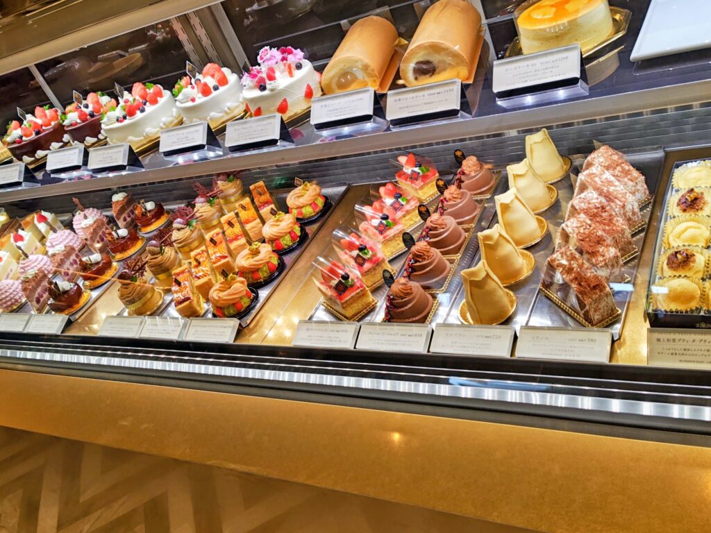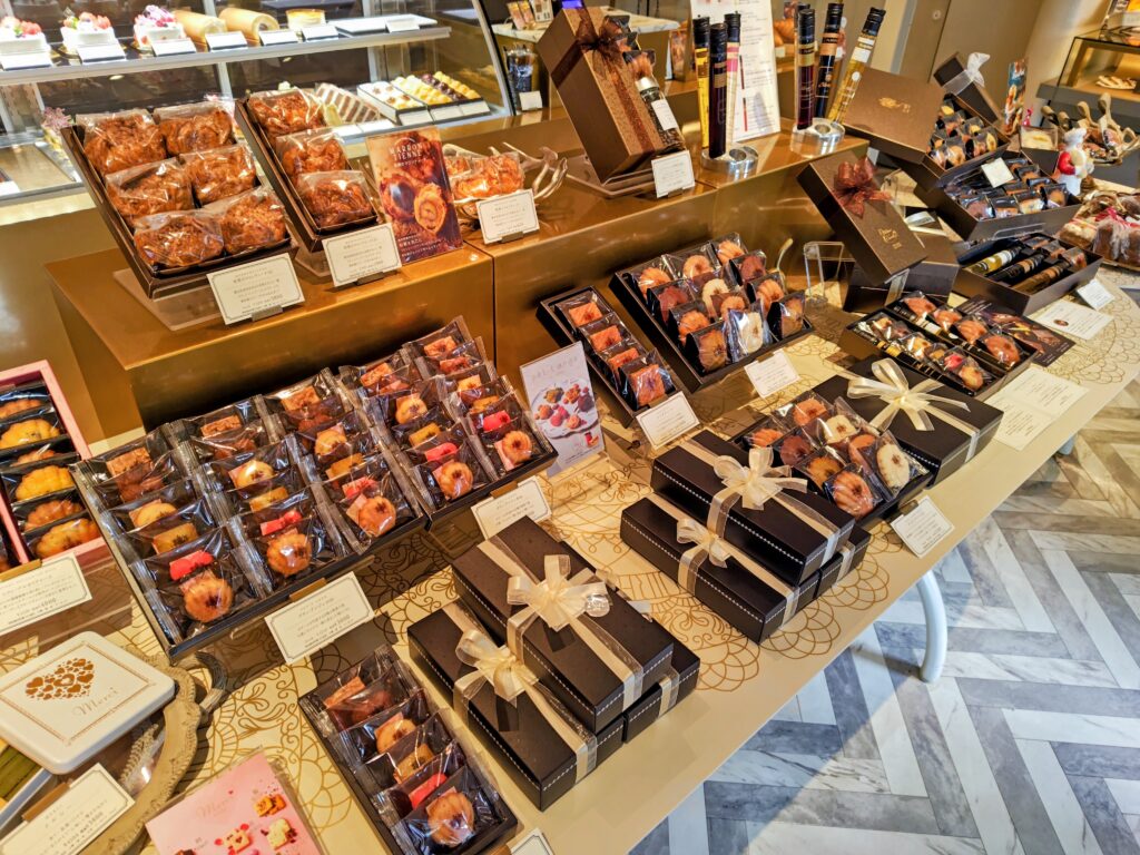 焼き菓子、パン、スイーツが高級感ある店内に飾られています。