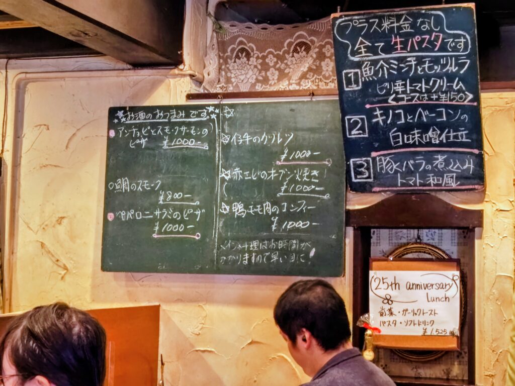 全席禁煙、全25席(カウンター5席、テーブル20席)、黒板にメニューの記載あるレトロな店内です。