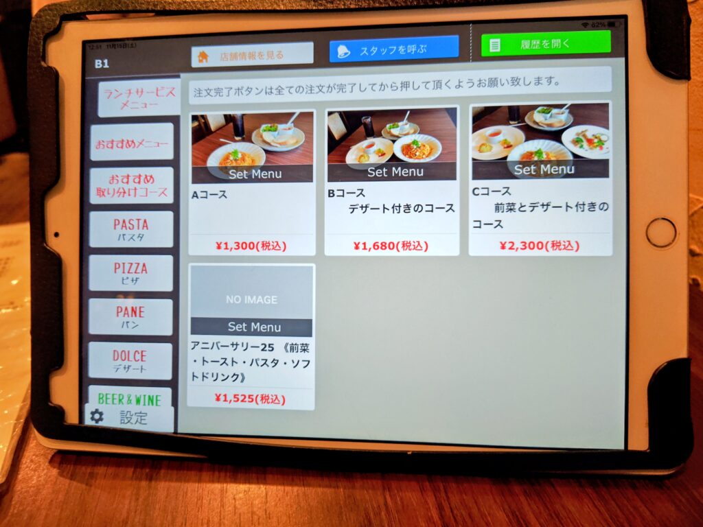 パスタ、ガーリックトースト、ドリンクはタブレットから1品ずつセレクトです。
