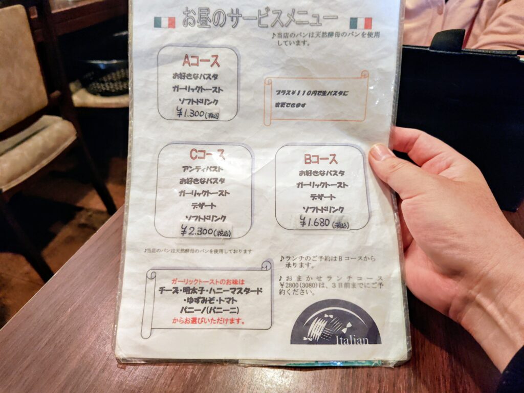紙のランチメニューはA・B・Cコース、パン、ドルチェ、ドリンク、パスタ6種。