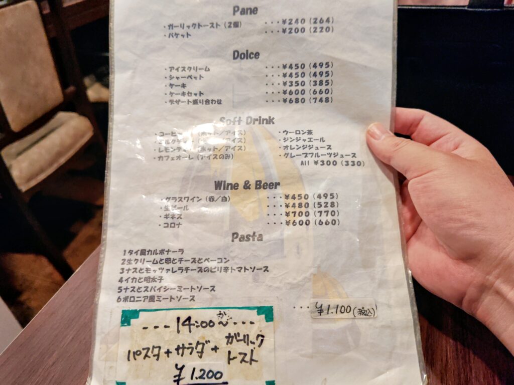 14時~限定でパスタ+サラダ+ガーリックトースト1,200円は、パスタ単品1,100円と比較してお得です。