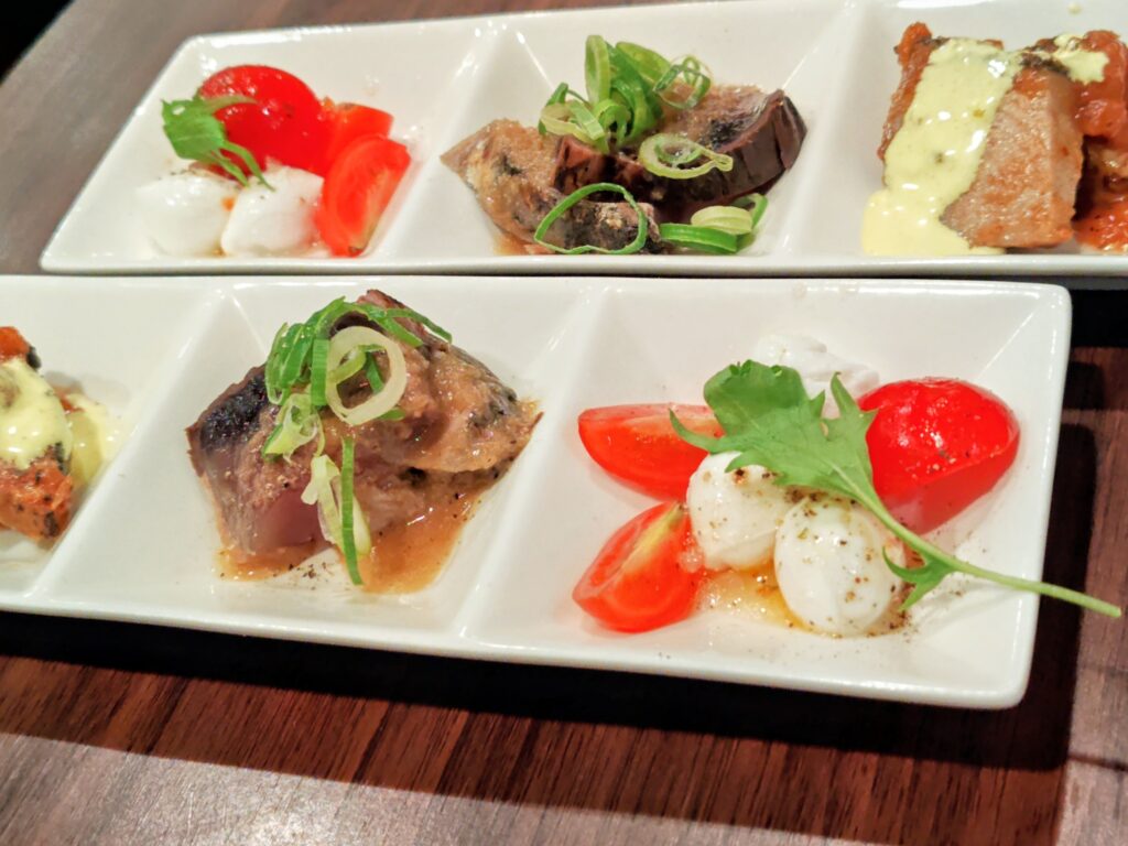 3種はトマトとモッツアレラのオリーブオイル、鰹のマリネ、鮪のトマト煮込み。