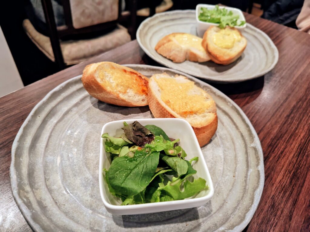 天然酵母のフランスパン使用、焼き立てのもっちりに明太子ソースの焦げ具合がマッチしています。