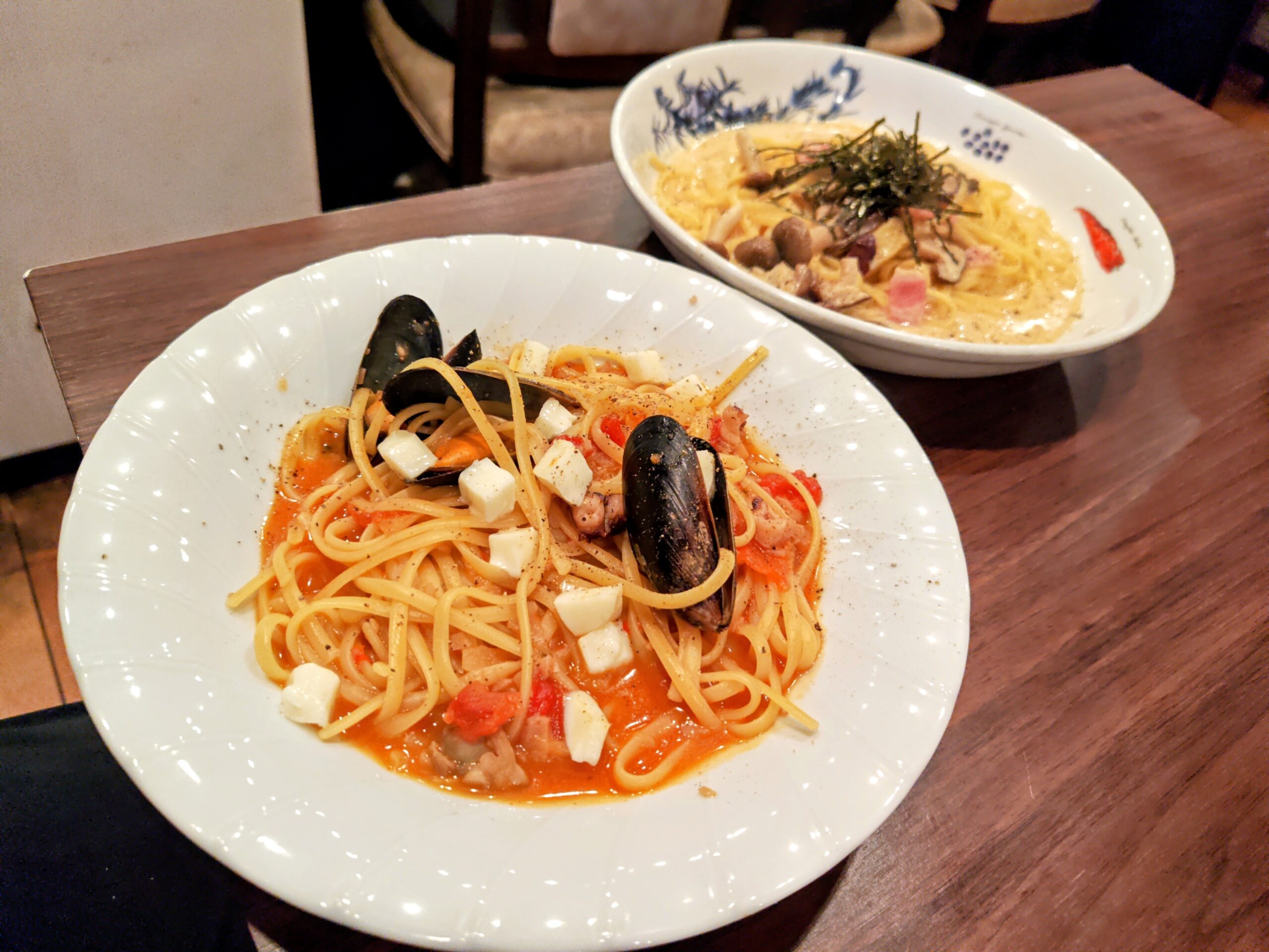 よめ⇒キノコとベーコンの白味噌仕立、だんな⇒魚介ミンチとモッツアレラ ピリ辛トマトクリームをセレクト。