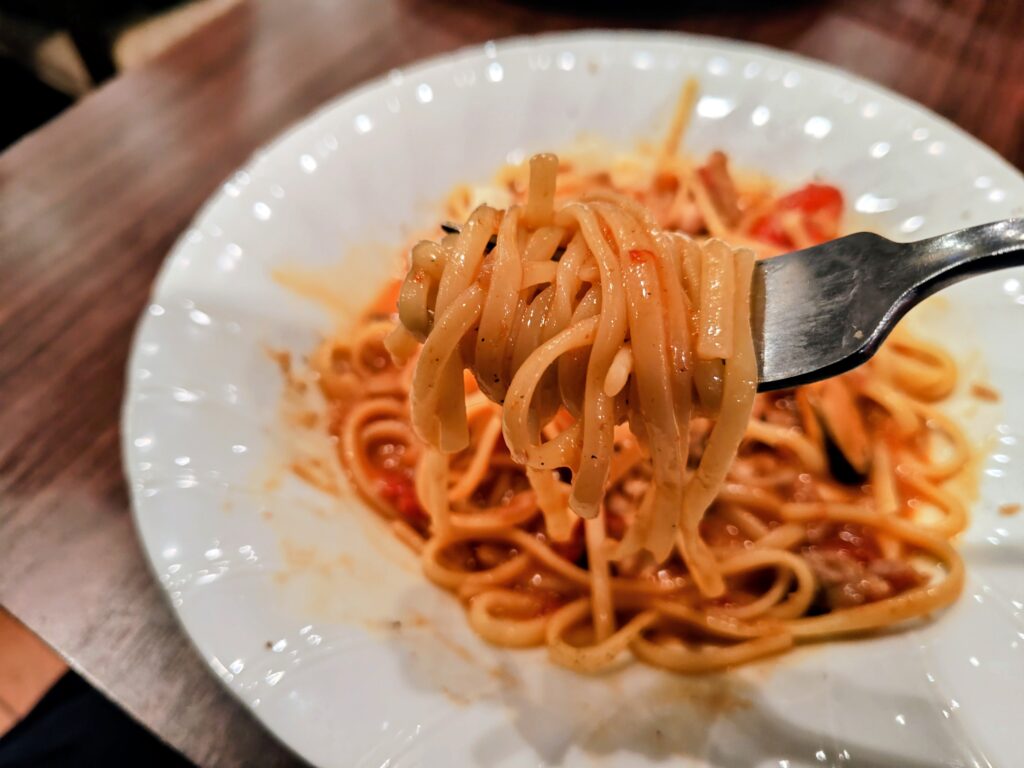 パスタは+150円(※コースのみ追加料金)の魚介ミンチとモッツアレラ ピリ辛トマトクリームをチョイス。