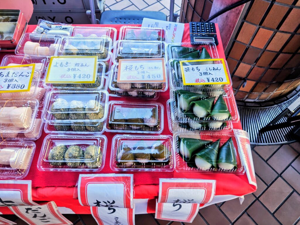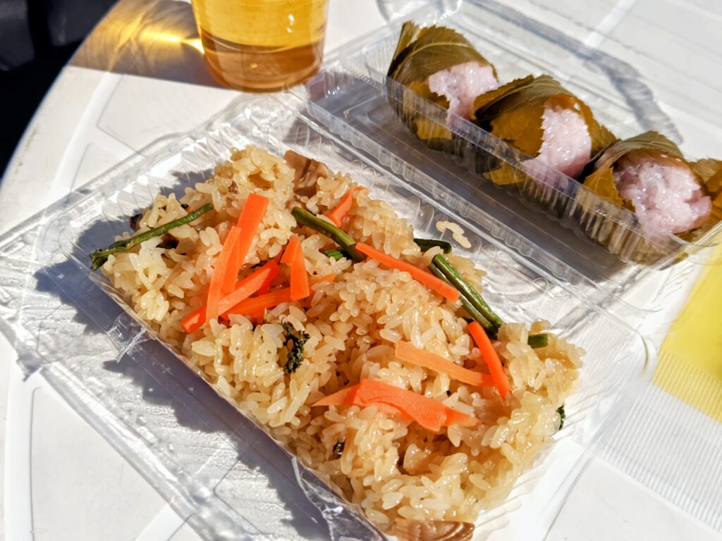 山菜おこわ350円、桜もち450円の合計800円なり。