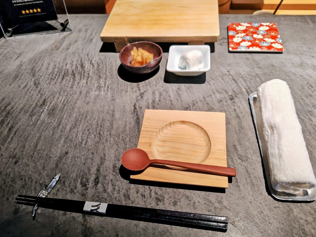 卓上には白木の鮨台、ガリ、指拭きのおしぼり、茶碗蒸しの台、スプーンが整然と並べられています。