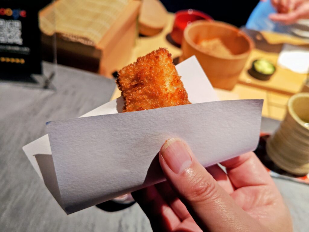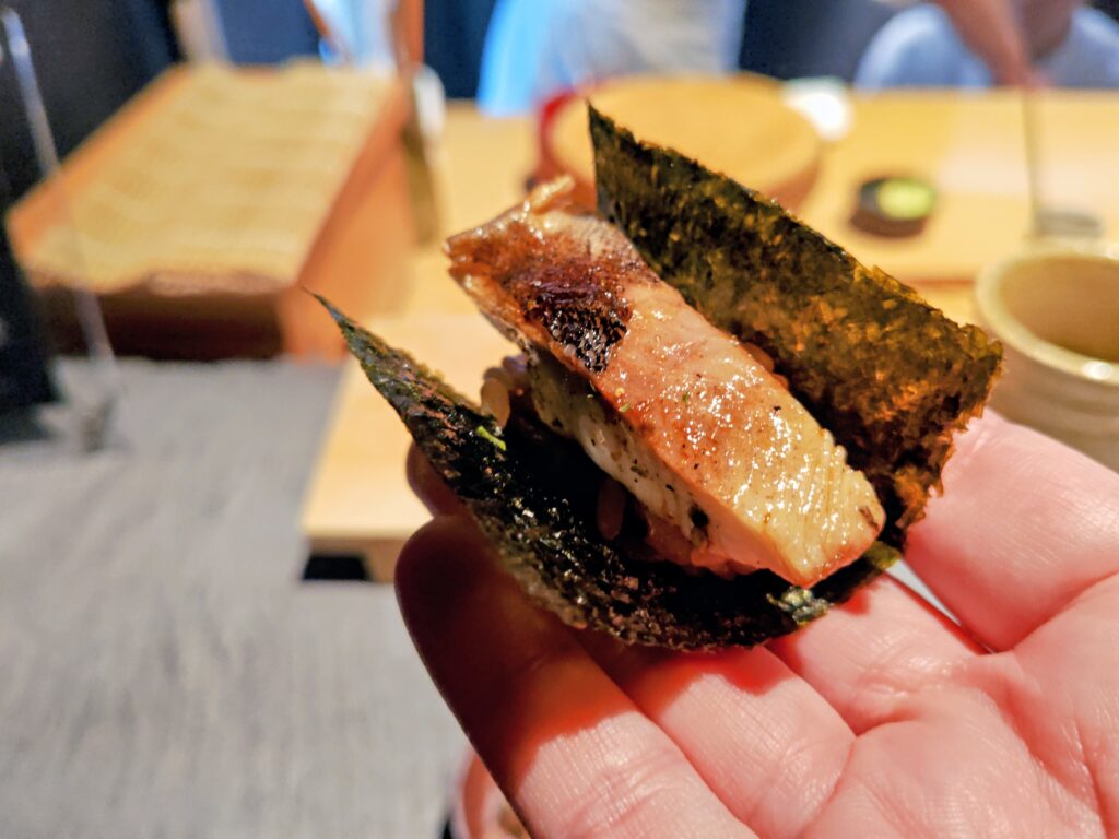 焼いたほっけとシャリを海苔巻き、手渡しでいただきます。