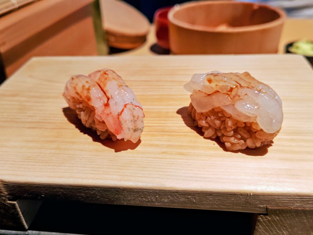 丁寧に1匹1匹殻を剥き、繊細な白エビの甘みがこの赤酢シャリによくあいます。